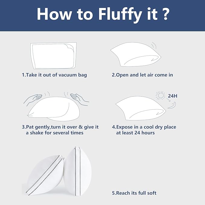 - Easy Care: The pillow set is machine washable which can save you more time and effort. For year-round softness and prevent pilling up, it's highly recommended to wash it in the gentle cycle with cold water, sun-dry or tumble dry in low when needed. Due to vacuum packaging, please open the pillows before use and leave it for 24 hours before use. After patting, the pillows will return to the fluffy state.