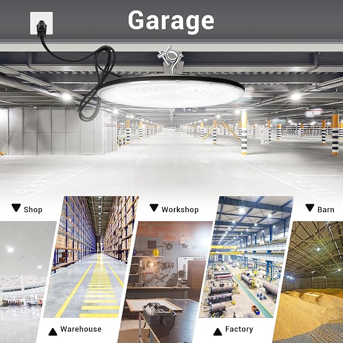 - 【Easy & Quick Installation】This UFO Led High Bay Light can be easily installed in seconds with the 5FT power cord provided and the built-in hook. It comes with US plug with which you can plug to the power directly, safe and secure for extremely easy installation. Ideal indoor lighting,This LED highbay light can work under power supply of AC 120V