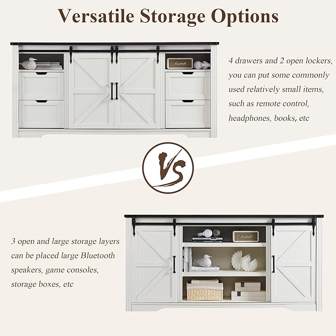 - Farmhouse Style: Our TV console showcases 2 distinctive barn doors, and behind the barn door are four semi-hidden drawers,Imitation wood grain stickers in different colors and styles enrich the character, Elevate your living space with the rustic elegance of our Farmhouse-Style TV Console