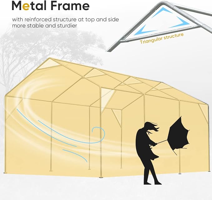 - 【Easy to Set up & Multipurpose】- The tool-free frame makes its set-up super quick and easy. Step-by-step instructions are included. Usually, two or more adults can install this portable car tent in an hour. The portable carport is perfect for parties, fairs, and birthdays, and also for storage shelters like boats, trucks, lawn and garden equipment, etc.