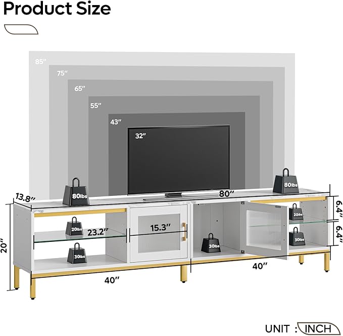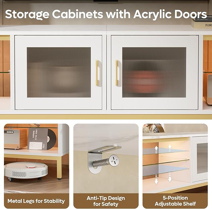 - 【Spacious Storage】The modern white tv stand offers abundant storage with 2 adjustatble glass shelves and 2 acrylic storage cabinets. There are 2 open glass shelves on both sides, which can be easily adjusted to 3 different heights, providing ample space to display PS5 , Switch, Xbox console, DVD, remote controls, gaming accessories or books