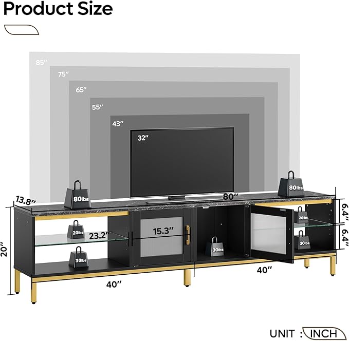 - 【4-in-1 Multipurpose Design】This TV stand for 85 inch tv adapts to your different needs with 4 installation options. Use it as a long TV stand with the storage cabinet centered or on either side, transform it into an L-shaped corner TV stand, or even a stylish coffee table. The versatile design fits any room layout, making it a perfect addition to your living space