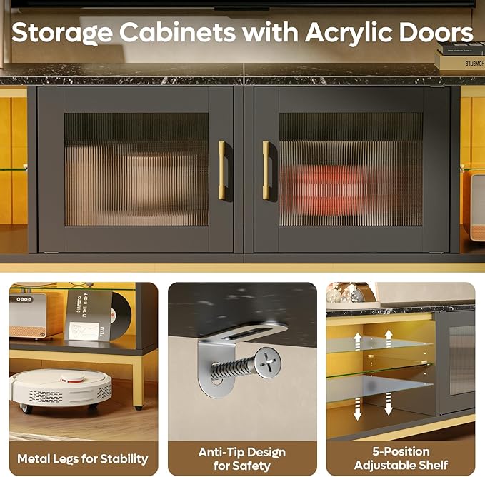 - 【Spacious Storage】The TV table offers abundant storage with 2 adjustatble glass shelves and 2 acrylic storage cabinets. There are 2 open glass shelves on both sides, which can be easily adjusted to 3 different heights, providing ample space to display PS5 , Switch, Xbox console, DVD, remote controls, gaming accessories or books.