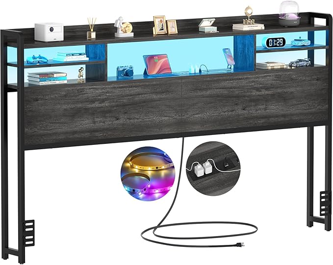 - 【Practical 2-Tier Shelf with Safe, Rounded Corners】 Crafted with a stylish wood and black iron frame. The spacious 2-tier shelf is perfect for keeping items like phones, glasses, alarm clocks organized, creating a neat and clutter-free sleep space.Can even place a small projector on the shelf for an movie night. With its elegant design and thoughtful safety features, including rounded corners, this headboard effortlessly elevates your bedroom while ensuring a safe environment for your family.