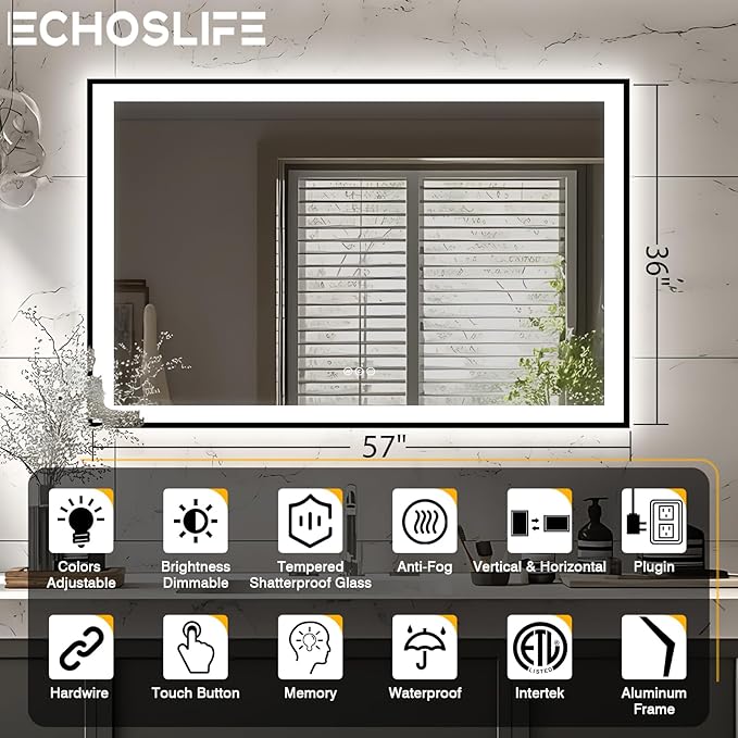 - [Space Black Aluminum Frame] Unlike other large LED bathroom mirrors, EchosLife's mirrors feature modern space black aluminum frames that create sophisticated atmospheres and add authentic touch of luxury.