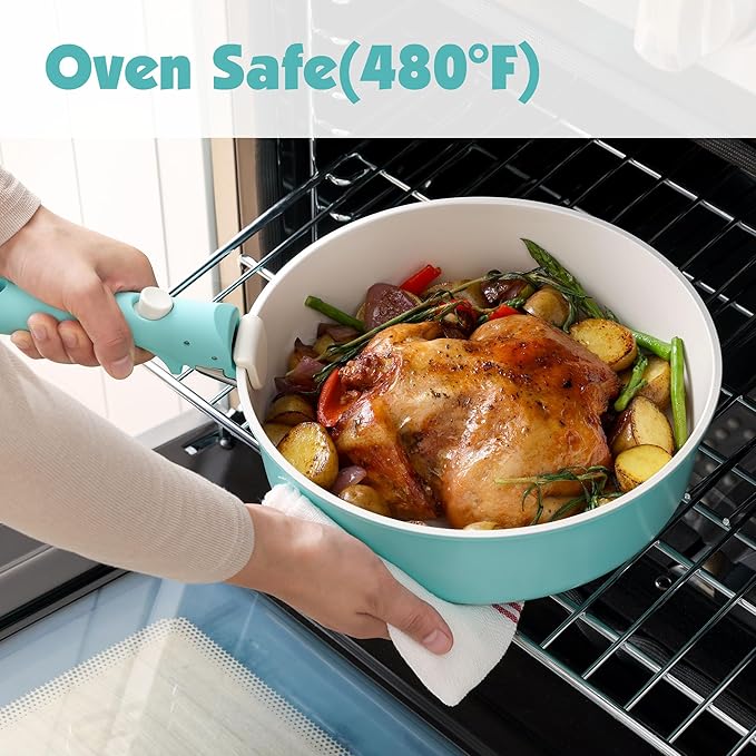 SENSARTE 17 Piece Ceramic Pots and Pans Set, Nonstick Detachable Handle Cookware, Induction Kitchen Cookware Set with Removable Handle, Dishwasher & Oven Safe (Turquoise)