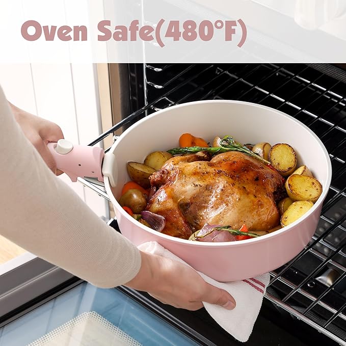 SENSARTE 17 Piece Ceramic Pots and Pans Set, Nonstick Detachable Handle Cookware, Induction Kitchen Cookware Set with Removable Handle, Dishwasher & Oven Safe (Pink)