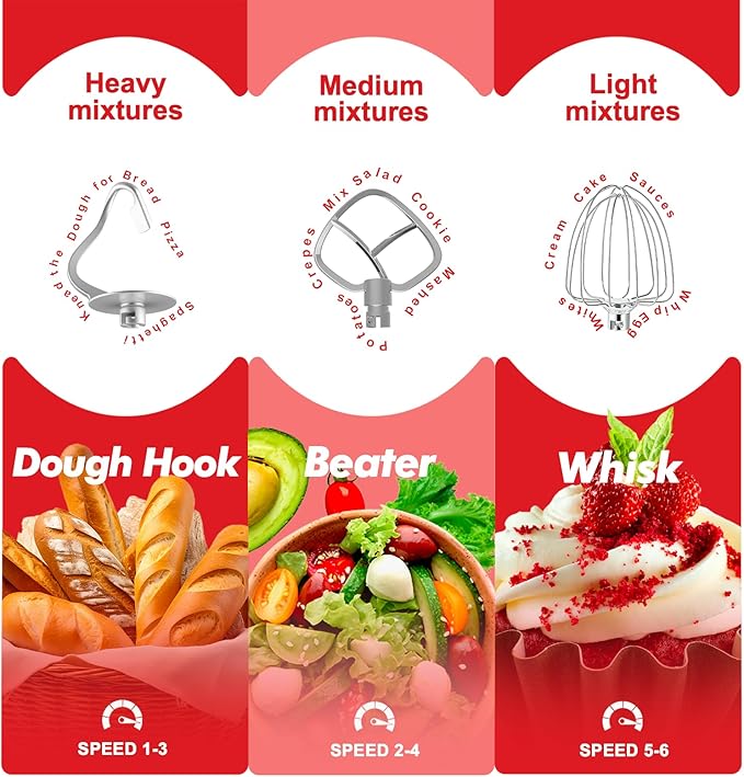 - 6.5QT Mixing Bowl with Handle: Our stand mixer has a 6.5QT stainless steel mixing bowl, which is ideal for mixing and cooking a variety of ingredients, sufficient capacity to make various types of bread; cookies; pizza; cream cakes and mix salads