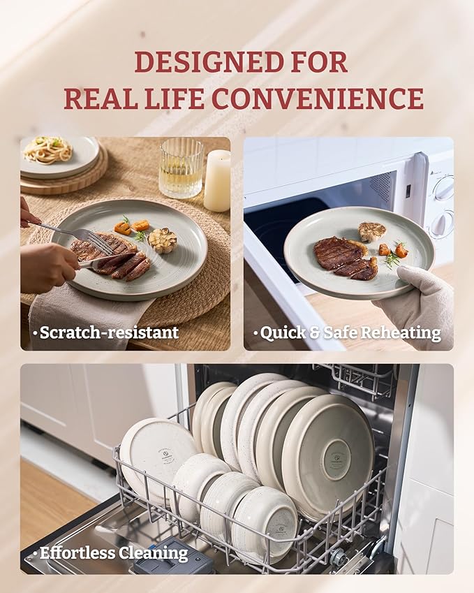 - 【SCRATCH RESISTANT】Our glaze is fired at 2340℉ for 13.5 hours to form a strong scratch resistant surface. No need to worry about scratches from your forks or knives.