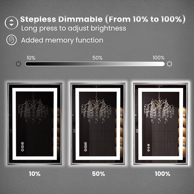 - [Anti-fog]: After a few minutes of opening the defogger, the heater in the mirror will disperse the fog from the center to sides, the mirror will still reflect clearly in the bathroom surrounded by hot air; It will turn on with the power on and automatically turns off after 1 hour