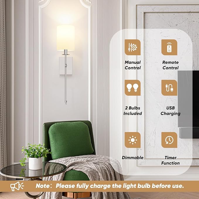 - 【Powerful 15 Color Lights Rechargeable Bulb】The included bulb boasts upgraded magnetic functionality and detachable charging. Simply pull it off and charge with the provided Type-C cables. It fully charges in 2.5 hours for up to 60 hours of runtime. With three color temperatures, 12 light colors, and 2 dynamic modes, whether you seek a comfortable warm glow for relaxation, bright light for productivity, or vibrant RGB colors to add flair to your room, this rechargeable sconces has you covered(Note:Please fully charge the light bulb before use.)