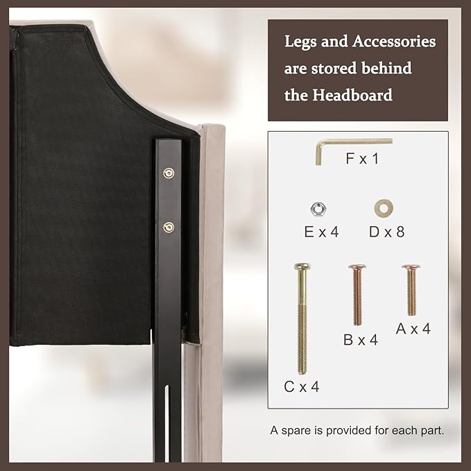- 【Easy Assembly】Tools included for easy assembly. Remind: Legs and components are cleverly stowed behind the headboard, simply retrieve them for assembly ease. Please note that colors may appear slightly different under various lighting conditions (natural/daylight, fluorescent, LED, etc.) due to velet material properties.