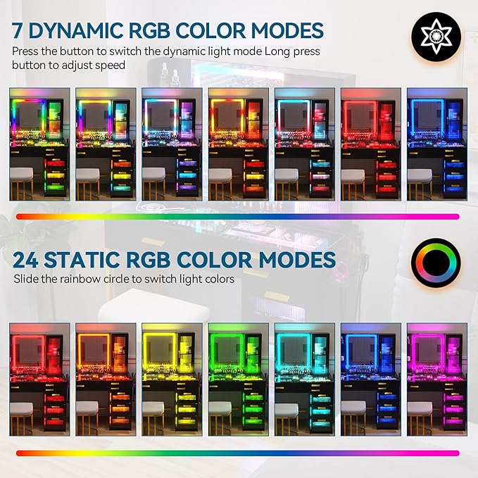 - đșăRGB Lightingă Dresser comes with dynamic and static lighting and a remote control allowing you to control it remotelyïŒYou can also feel the light in your body