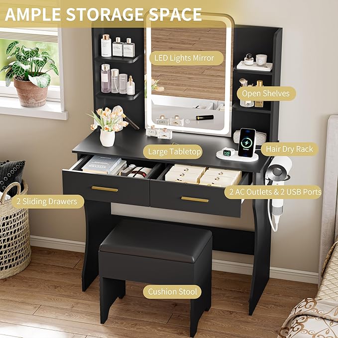 Vanity Desk with LED Lights Mirror & Power Outlet, Small Makeup Vanity Table Set with Storage Drawers & Chair, 3 Lighting Modes & Adjustable Brightness, Dressing Table for Women Girls Bedroom, Black