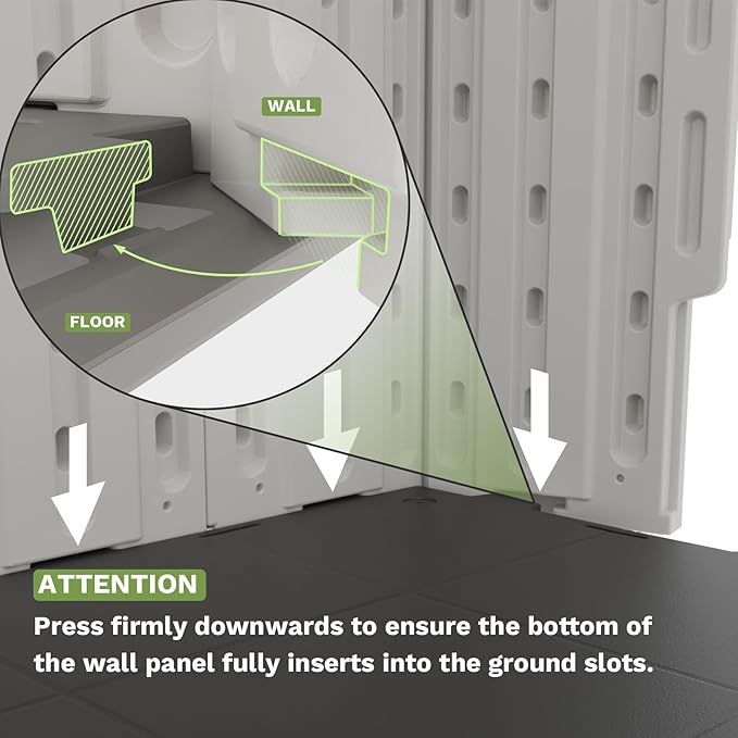 - Interesting “Kick-it” Installation Process: This shed reduces the number of screws needed by 30%, making assembly quicker and easier. * When installing wall panels with a kicking action, press firmly downwards to ensure the bottom of the wall panel fully inserts into the ground slots. As shown in the video, once the bottom of the wall panel aligns perfectly with the ground, proceed with the kicking action.