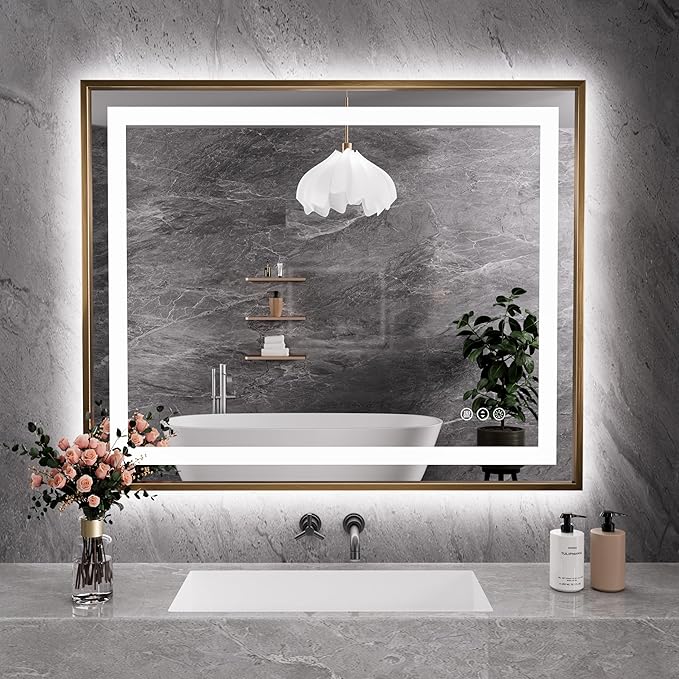 - [Double Bright Lights & Gold Frame]: With built-in LED strip light, Amorho LED bathroom mirror with front light and backlit both to show more bright; And the matte aluminum frame wrapped around make the mirror more delicate