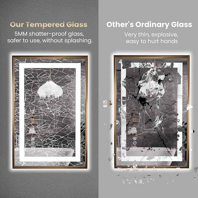 - [Double Bright Lights & Gold Frame]: With built-in LED strip light, Amorho LED bathroom mirror with front light and backlit both to show more bright; And the matte aluminum frame wrapped around make the mirror more delicate