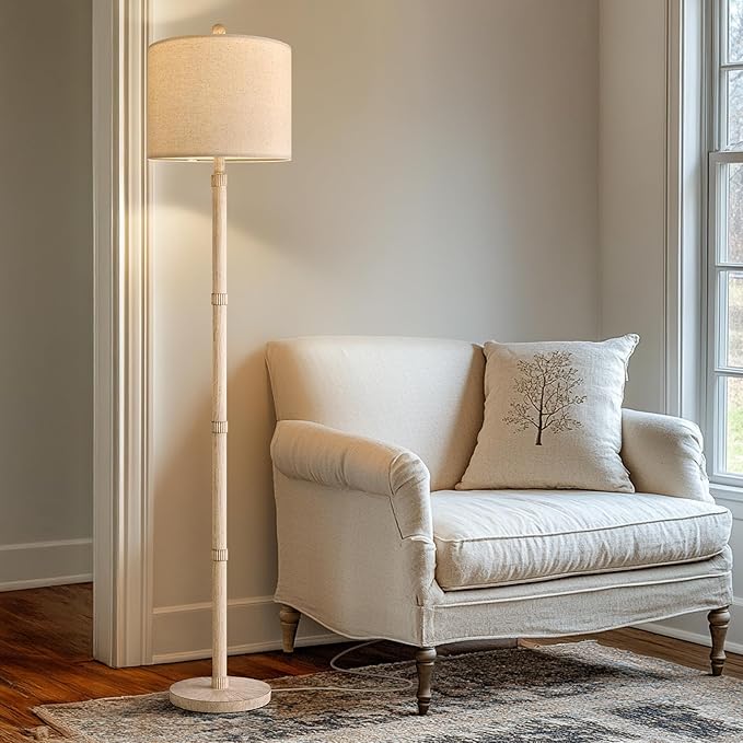 - 【Retro and elegant design】: Bring a warm ambiance to your home with this Washed white color floor lamp, featuring unique knobby details that add an elegant sence to your decor. The linen shade diffuses light softly, creating a cozy and comfortable atmosphere.