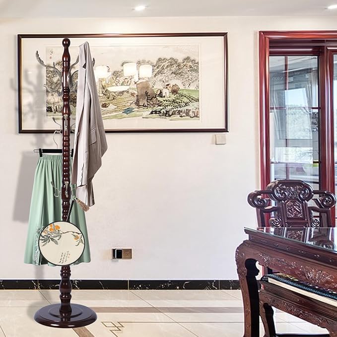 - 【CLASSIC EUROPEAN STYLE】The wooden coat tree is designed in a luxurious European style, with a simple structure and comprehensive functions. adopts natural birch tree, with high density and strong texture. The main body of the clothes hanger is made by drilling holes on a lathe, and after repeated manual grinding, and it can be hung without damaging clothes.