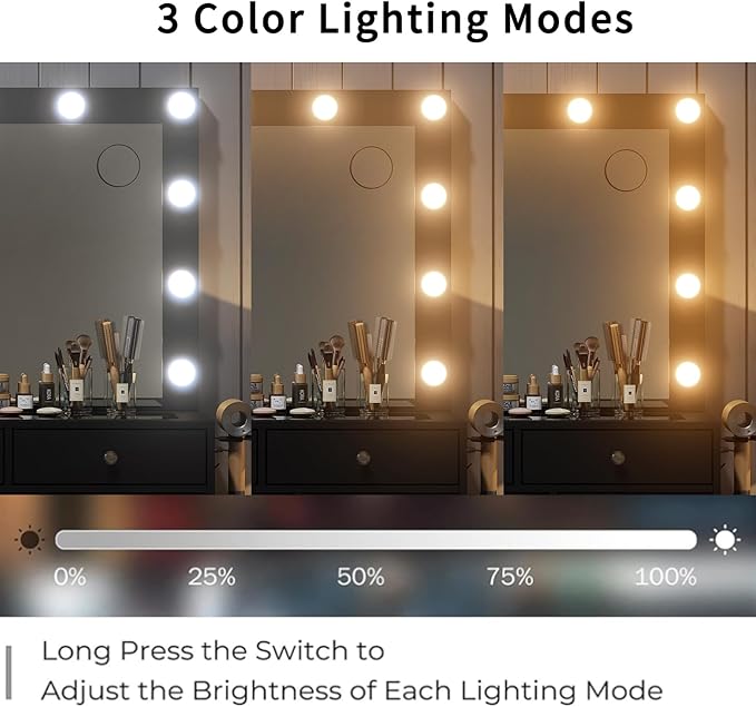 - 3 Lighting Modes: 12 Hollywood light bulbs is surround the large and clear mirror to meet your makeup needs; Vanity with lights includes 3 adjustable lighting modes: cold light, natural light and warm light,long pressing the switch can change lighting color; The makeup vanity will be the best partner for makeup, live broadcast or vlog recording
