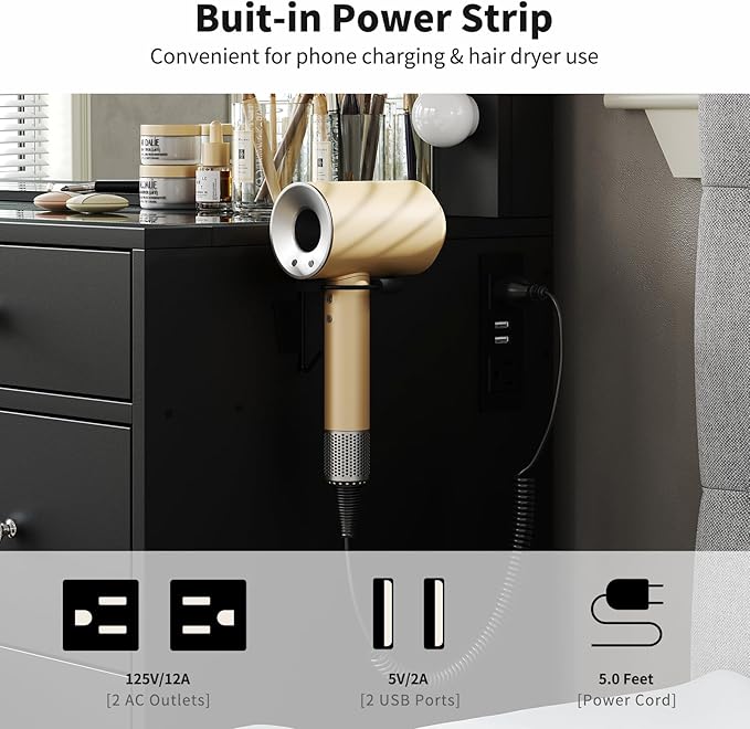 - Vanity Table Come with Power Outlet: Vanity comes with a hair dryer stand and power outlet; Charging station includes 2 standard plug sockets and 2 USB ports to connect your hair dryer, curling iron, computer, cell phone, ipad and other devices, so that all activities can be carried out on this vanity table
