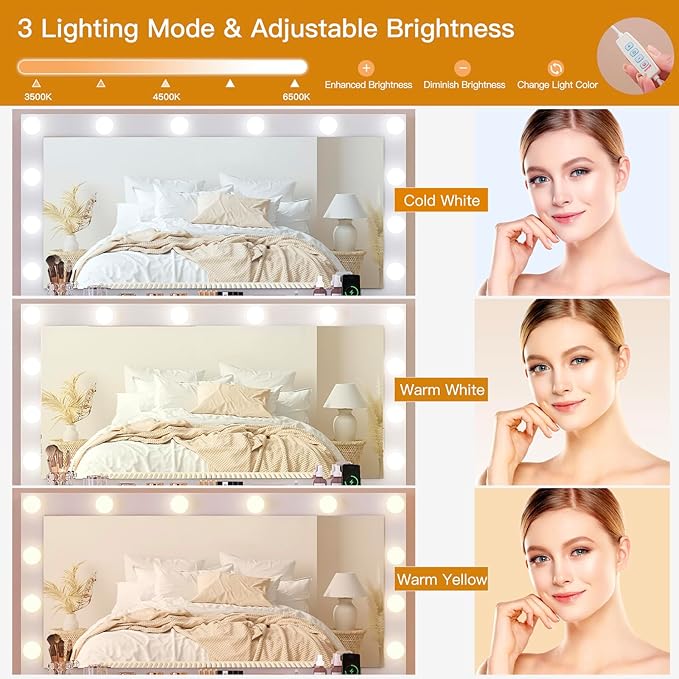 - Large Lighted Mirror: The Vanity comes with a large mirror with 12 tri-color light bulbs with adjustable brightness, designed for different light environments can be switched at will, accurate lighting makeup more natural, easy to meet the needs of different occasions