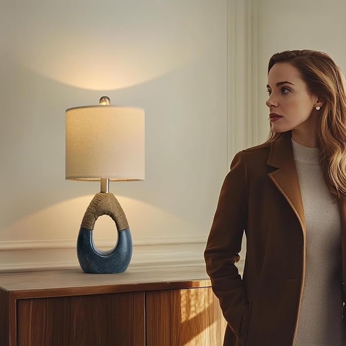 - Unique Farmhouse Table Lamp: Unique design, classical without loss of modernity, The modern bedside lamp was designed as an egg shape with hollow middle that you could carry it easily, the upper part of cotton and linen allowing you to hold it firmly, for you need light well in many place. Our nightstand lamp especially suitable as your work lamp, reading light for your bedside table and nightstand, or as an deco light on top of end tables in your living room.