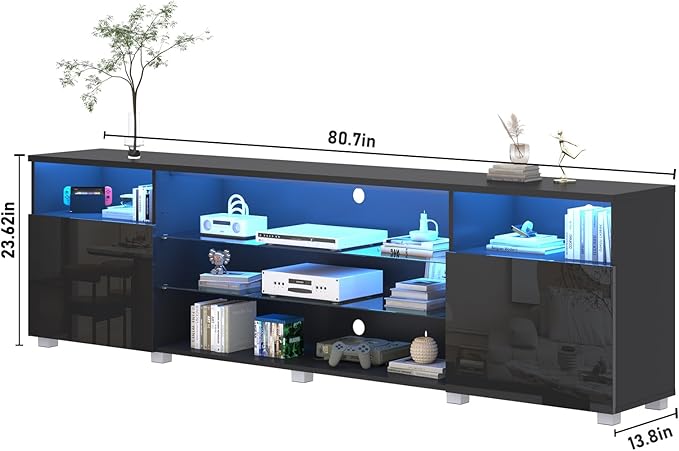 St.Mandyu LED TV Stand for 75/85/90 inch TV, Modern Television Table Center Media Console with Drawer and Led Lights, High Glossy Entertainment Center for Living Game Room Bedroom(Black)