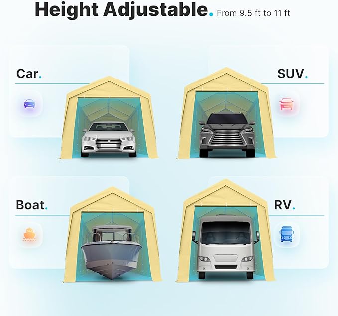 - 【4 Adjustable Heights】- There are 4 options for the side height of this metal carport, which are 6.5ft, 7.0ft, 7.5ft, 8.0ft, accordingly peak height 9.5ft, 10.0ft, 10.5ft, 11.0ft. You can choose a suitable height for all kinds of your needs.The height of the side panel also can be adjusted.