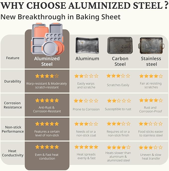 - HEAVY DUTY ALUMINIUM STEEL: Our ceramic bakeware sets non stick are made of 0.6 mm thick heavy duty aluminized steel. The thickened design ensures long-lasting performance. These pans have superior rust and non-stick properties compared to traditional aluminum, carbon steel or stainless steel pans. They can withstand temperatures up to 500°F, ensuring perfectly even results every time you bake.experience for your family.