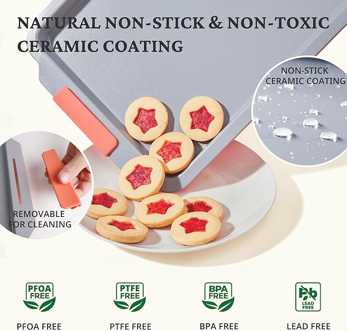 - NON-STICK & DISHWASHER SAFE: The baking set's unique ceramic coating provides superior non-stick performance, three times that of traditional coatings. Easy release and quick cleanup reduces the use of water and detergents, dishwasher safe, reduces carbon footprint and saves time and energy.