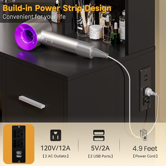 - Makeup Vanity With Charging Station: This vanity desk comes with 2 USB ports and 2 standard plug sockets on the side, immediately after applying makeup, you can use the curling iron and hair dryer to create a beautiful look that matches your makeup without having to look for a limited power source.