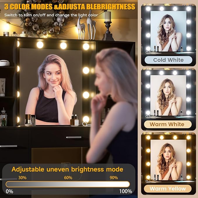 - Vanity Desk with LED Lighted Mirror: This vanity desk is equipped with a large HD mirror surrounded by 10 LED bulbs with 3 different color modes (cool white, natural light, warm yellow), and the brightness of each color of light can be adjusted, whether you want to create a natural look or a heavy smoky look, they will provide the perfect amount of light to ensure that every make-up application is a show of confidence.