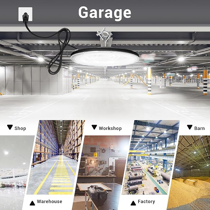 - 【Easy & Quick Installation】This UFO Led High Bay Light can be easily installed in seconds with the 5FT power cord provided and the built-in hook. It comes with US plug with which you can plug to the power directly, safe and secure for extremely easy installation. Ideal indoor lighting,This LED highbay light can work under power supply of AC 120V.