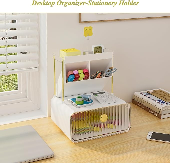 - Vanity and Desk Organizer: The vanity organizer can be placed in the bathroom and bedroom,the top tray can hold perfume, watches or jewelry, etc.; the brush holder can be used to organize lipsticks, makeup brushes and eyeliners, etc.; the drawer can be used to organize makeup sponges and so on.The stationery organizer can be used to organize markers, pens, sticky paper, paper clips and other commonly used office supplies.