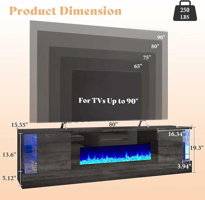 - [Dimensions & Specifications] TV Stand: 80"Wx19.3"Hx15.6"D, Electric Fireplace: 40"Wx13.7"Hx4.9"D. TV stand fits TVs up to 90" & 250lbs. Clear & detailed assembly instructions included, total includes 2 cartons & possibly delivered on separate days