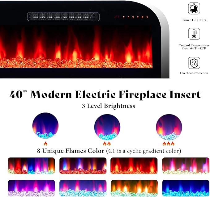 - [Large Multifunction Fireplace] CSA-certified fireplace contains 8 realistic flame colors & 8 crystal colors, 3 levels of dimmer, temperature control, and timer setting. 1400W power heat room size up to 400 sq. ft. can work with or without heat