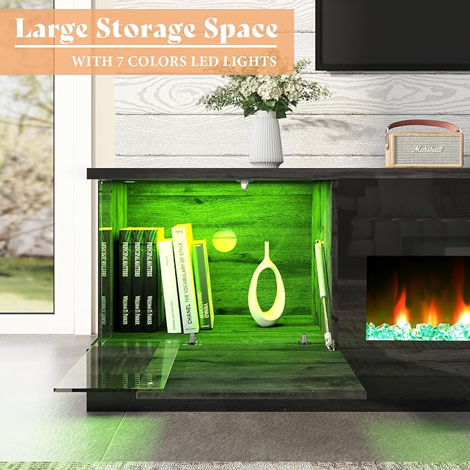 - [LED Lights TV Console] Includes a 7-color LED kit, which synchronizes with the fireplace crystal color and offers a total of 64 color combinations, transparent corner glass decor on both sides provides a home theater-like visual experience