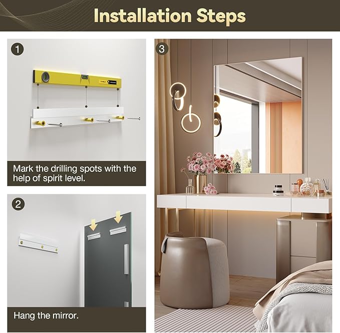 - Sleek Frameless Design: The square wall mirror with a frameless design adds a modern, minimalist touch, brightening bathrooms, living rooms, bedrooms, entryways, fireplaces, gyms, yoga studios and so on