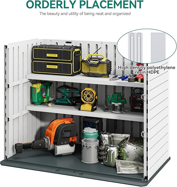 - Solid Construction: Crafted from durable HDPE material, this space-saving shelf ensures reliable support for your valuable items; Built to last for years, it's ideal for preserving your outdoor shed
