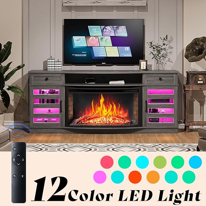 - LED TV STAND - 12 LED colors on the glass cabinets custom a personalized dazzle lighting atmosphere and unique experience. Remote or touch panel can control LED lights and Fireplace.
