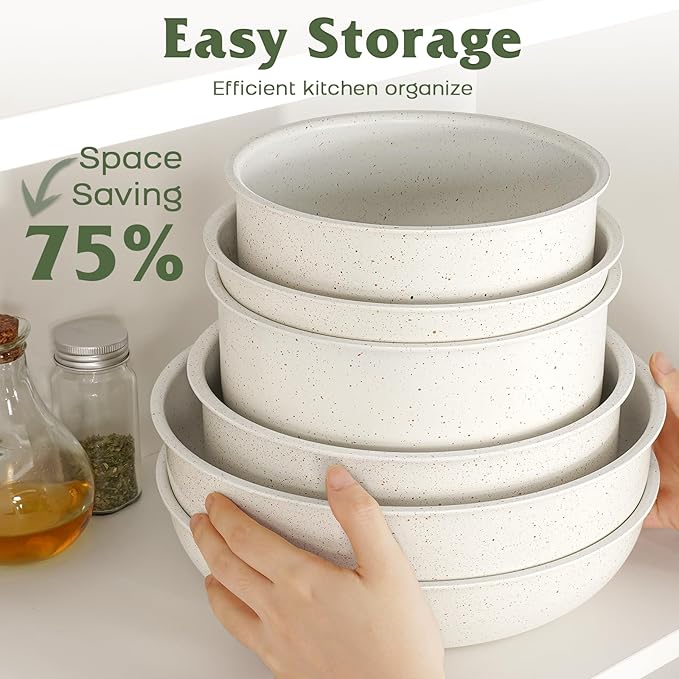 - Space-Saving Design – Pots and pans with detachable handles allow for compact nesting, optimizing 75% kitchen cabinet space and providing a healthy cooking environment,making for easy storage in cabinets or RVs.