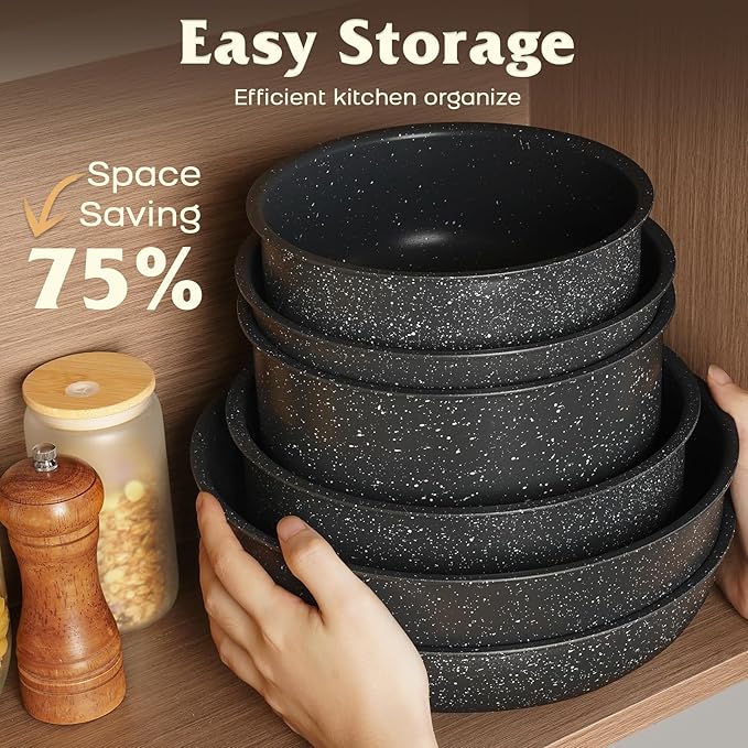 - Efficient Storage: Pots and pans set with detachable handles allow for compact nesting, optimizing 75% kitchen cabinet space and providing a healthy cooking environment,making for easy storage in cabinets or RVs