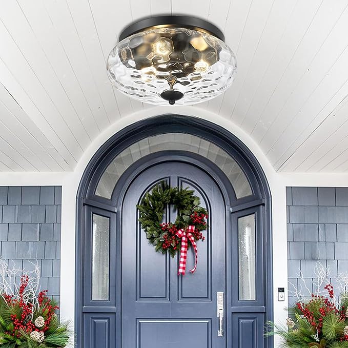 Darkaway Large Ceiling Light Fixtures, 3-Light Flush Mount Indoor Outdoor Ceiling Light with Water Ripple Glass Shade for Hallway Kitchen Bedroom Porch Living Room Black Finish