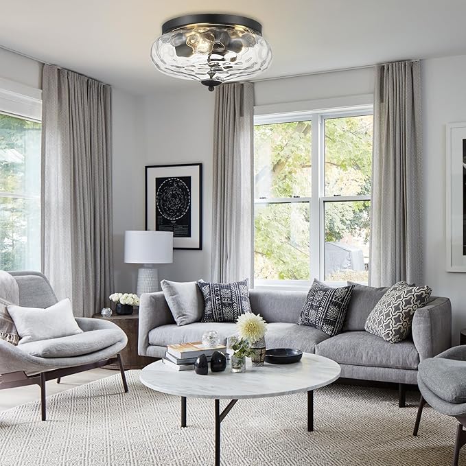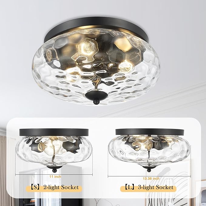- LARGE FLUST MOUNT CEILING LIGHT - Darkaway flush mount ceiling light with glass lampshade in black finish,with 3-light sockets, a simple but artistic look. water ripple glass creating a beautiful light effect. This ceiling light enhance the ambiance of your outdoor and indoor spaces