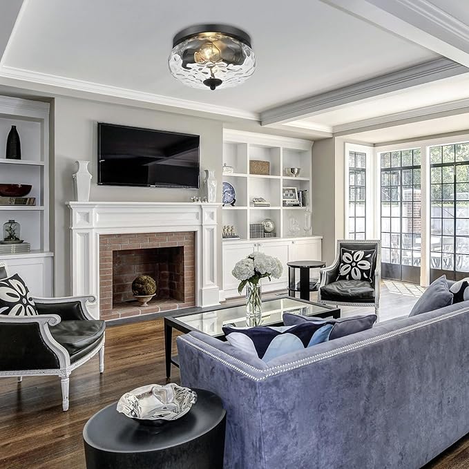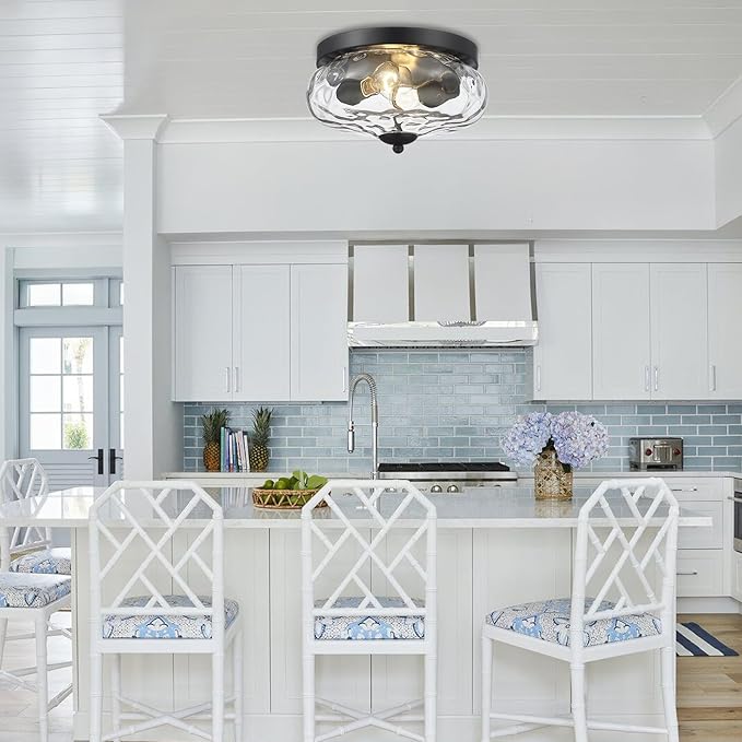 Darkaway Ceiling Light Fixtures Flush Mount Indoor Outdoor Ceiling Light with Water Ripple Glass Shade for Hallway Kitchen Bedroom Porch Living Room Black Finish