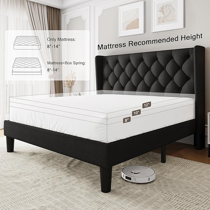 - Luxurious Wingback Design: This upholstered bed frame features an elegant button-tufted headboard with winged sides, providing both comfort and practicality. The soft, breathable linen fabric offers a cozy surface to lean against, while the winged sides help secure pillows and serve as a convenient top shelf for glasses or phones. The timeless design complements a variety of bedroom styles