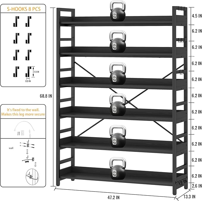 HCHQHS 6 Tier Bookshelf, Adjustable Industrial Bookcase, Vertical Tall Book Shelf, Wood and Black Metal Open Bookshelves for Home Office, Living Room, Bedroom