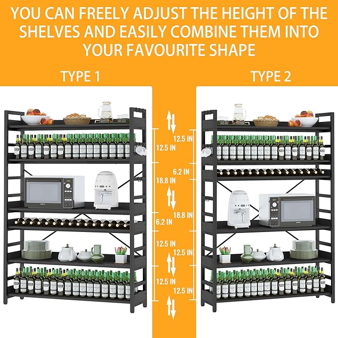 - 【8 Storage Hooks & Anti-Falling】The 5 tier bookshelf have different iron frame designs on each side, providing versatile storage options for products of various heights including books and ornaments. Additionally, 8 multipurpose hooks are included to hang headphones, toys, or other small decor.