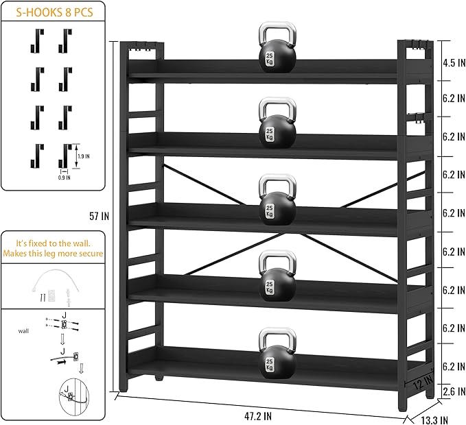 - 【8 Storage Hooks & Anti-Falling】The 5 tier bookshelf have different iron frame designs on each side, providing versatile storage options for products of various heights including books and ornaments. Additionally, 8 multipurpose hooks are included to hang headphones, toys, or other small decor.